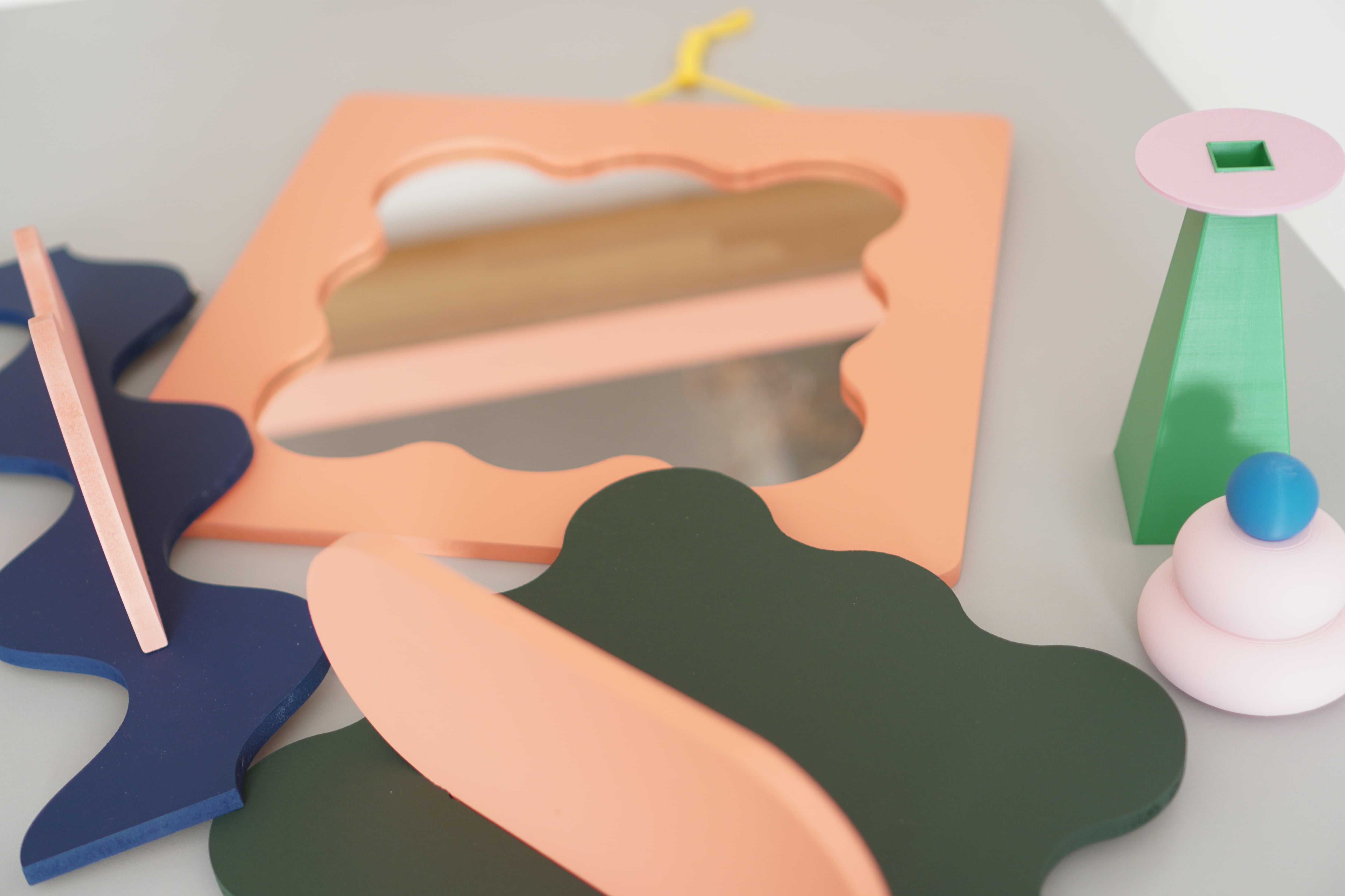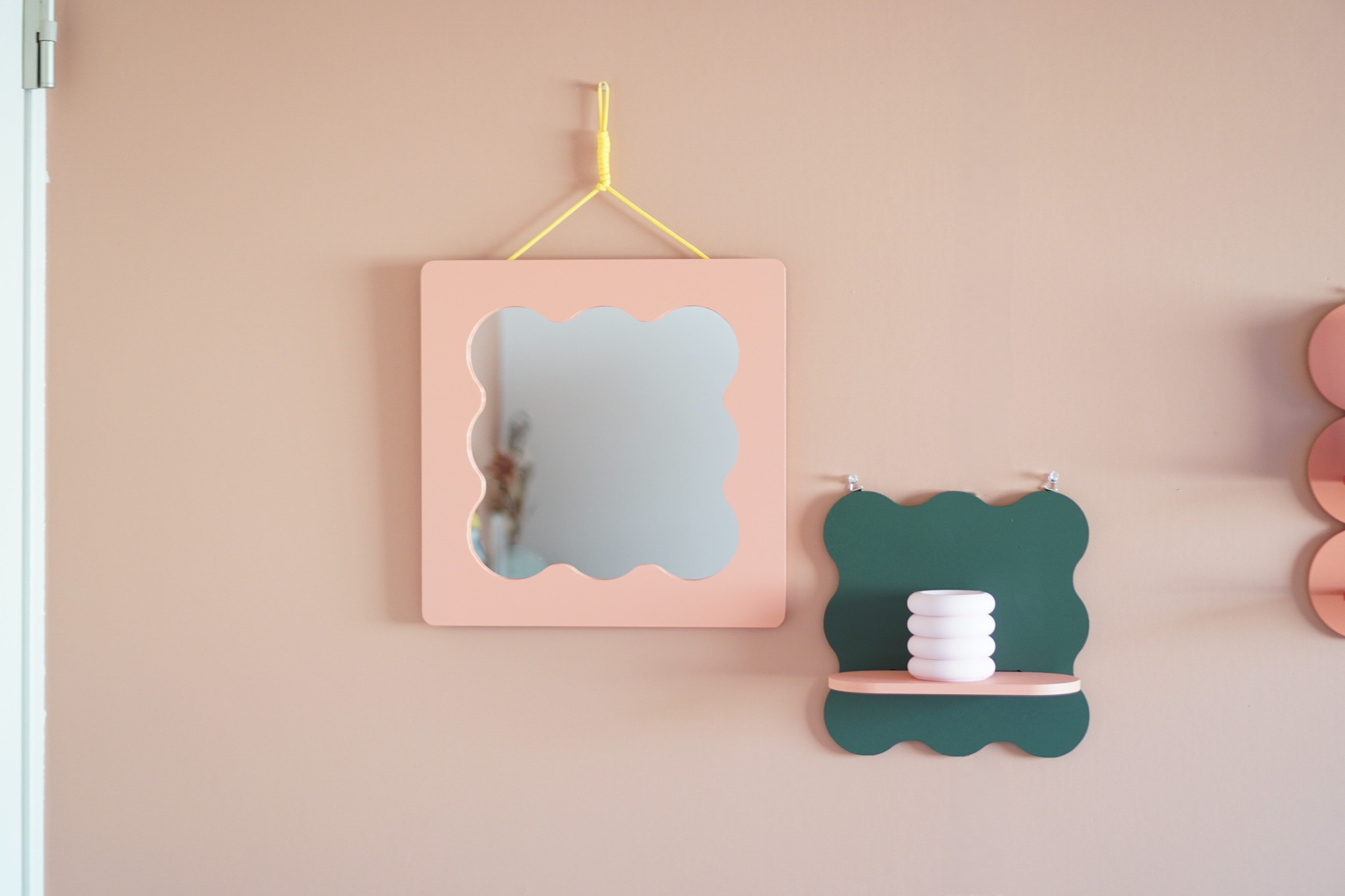 ウォールミラー(pink)とウォールミラーを切り抜いた中身を使用して製作したミニCOMOCO WALL(カラーランダム)のセットです。
